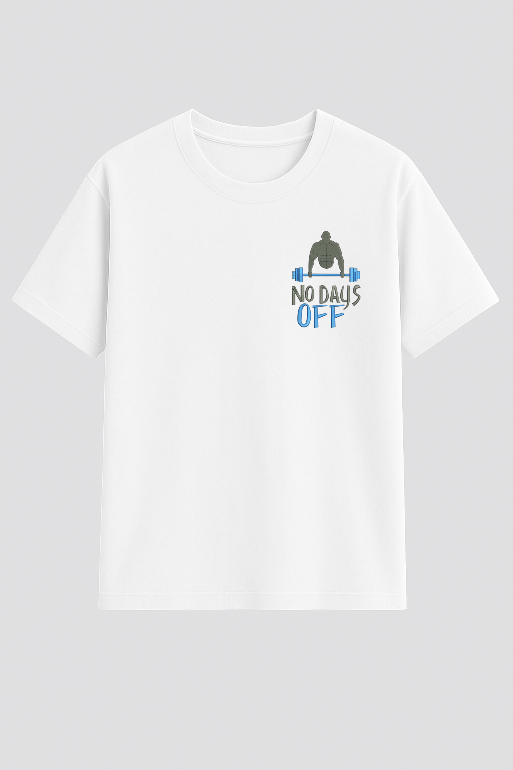 Kvalitní bavlněné tričko s precizní výšivkou svalnatého muže v kombinaci s nápisem "NO DAYS OFF". Výšivka je provedena strojově s důrazem na detail a dlouhou životnost.